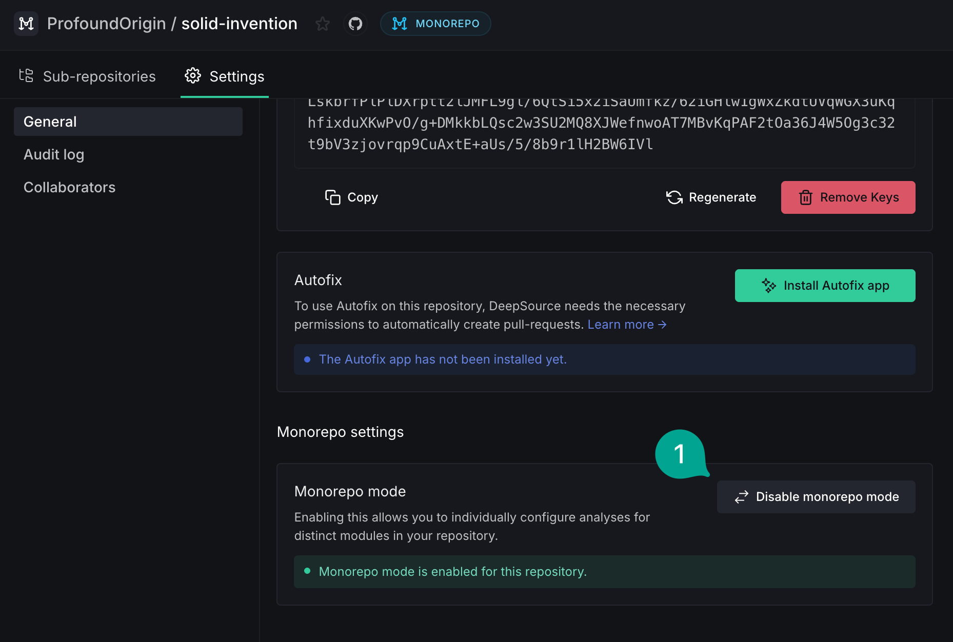If you have an existing DeepSource repository that you want to convert to a monorepo, follow these steps:- Navigate to the repository dashboard and go to the settings page.