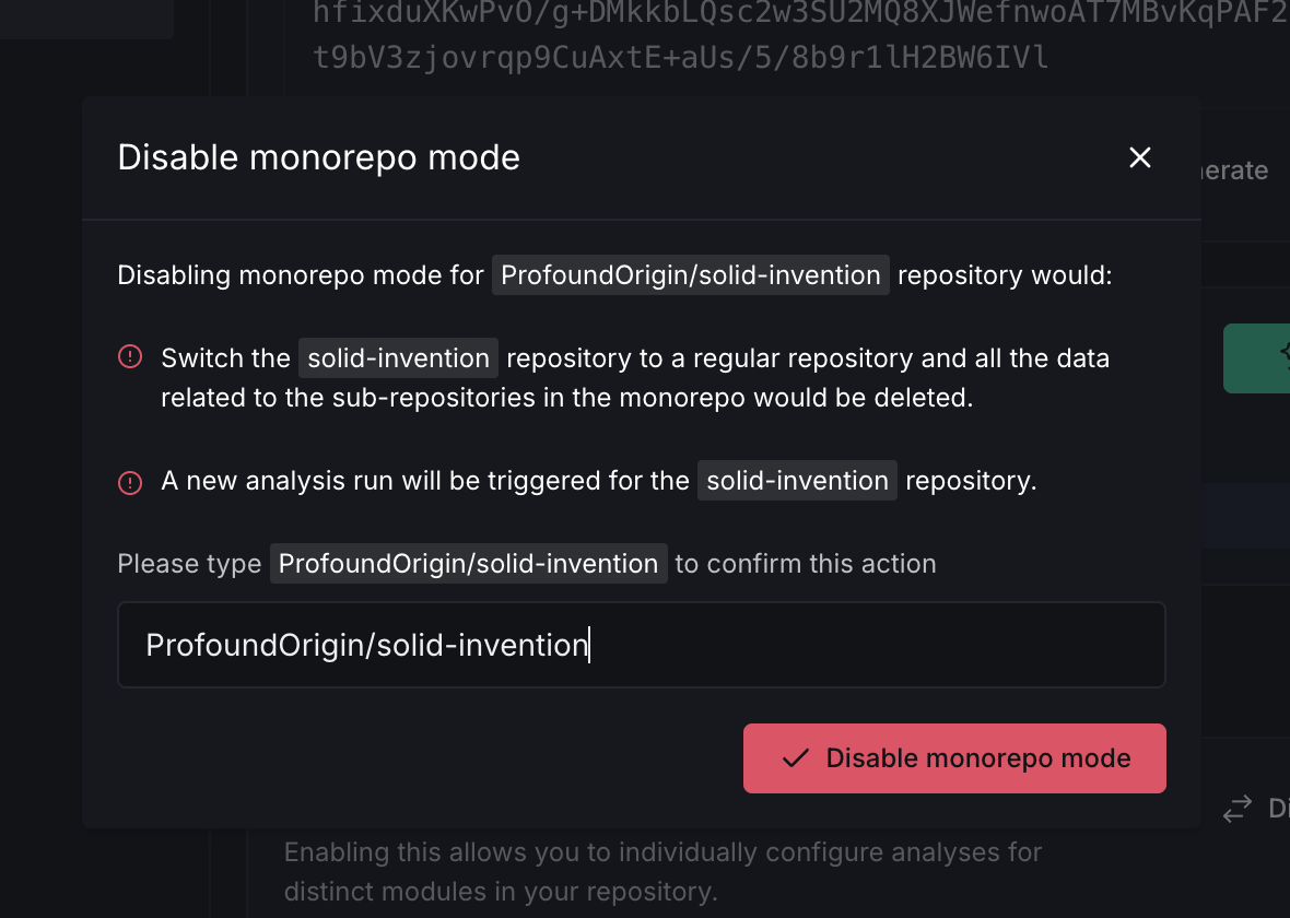 Disabling monorepo mode is a destructive action. All data tied to sub-repositories (metrics, reports, issues, and ignored issues) will be permanently deleted, and this cannot be undone.