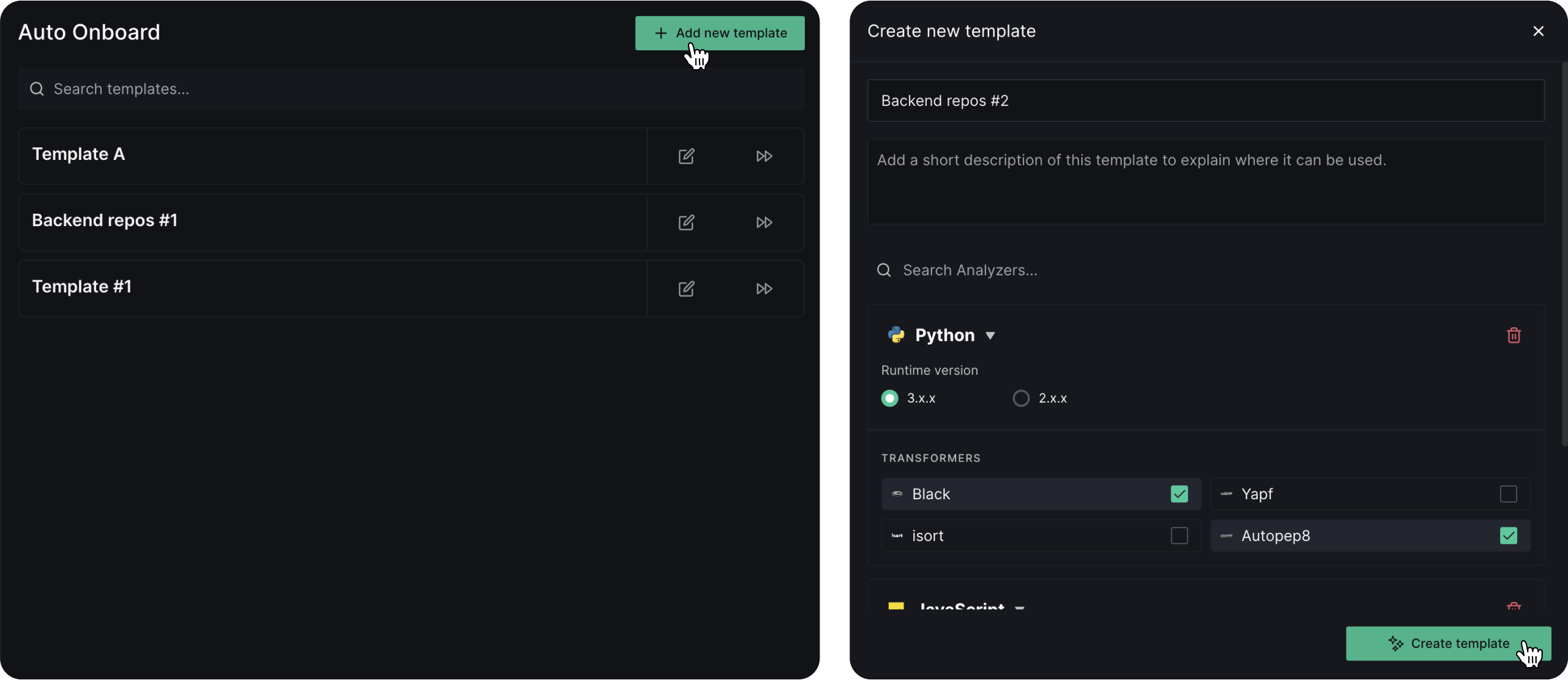With Auto Onboard, you can create configuration templates to easily activate analysis on multiple repositories in one go. This is especially useful for large teams with multiple repositories as it eliminates the need to manually configure the .deepsource.toml file and activate DeepSource for each repository. To create a new template, simply click on “Add new template”, give it a name and description, and select which Analyzers you want to enable for analysis. Once the template is created, click ‘Use template’ button and select the repositories to onboard this template with. DeepSource will automatically create pull requests to all the selected repositories with a.deepsource.toml file. Once merged, analysis will be automatically activated on your repositories.