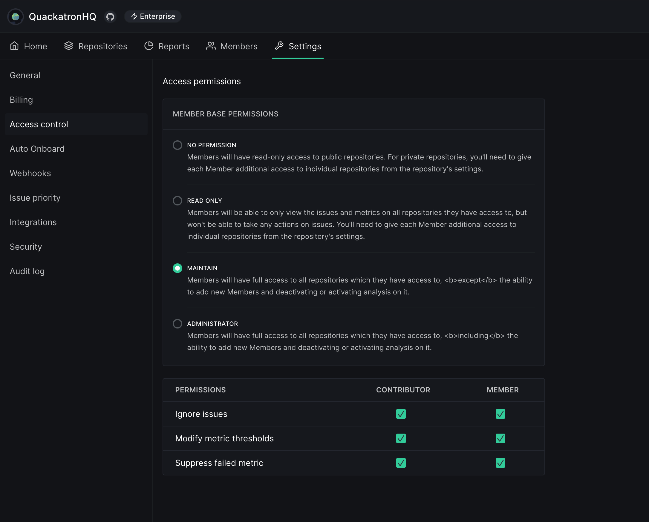 Team Administrators to grant or revoke permissions to members and contributors for ignoring issues, modifying metric thresholds, and suppressing failed metrics. This helps ensure that the right people have the appropriate level of access to manage issues and metrics effectively. To grant or revoke these permissions, go to the Issue, Metric Thresholds, and Suppress Metric Permissions section. From there, you can select which level of access to grant: member, contributor, or both. You can also choose to revoke access if necessary.