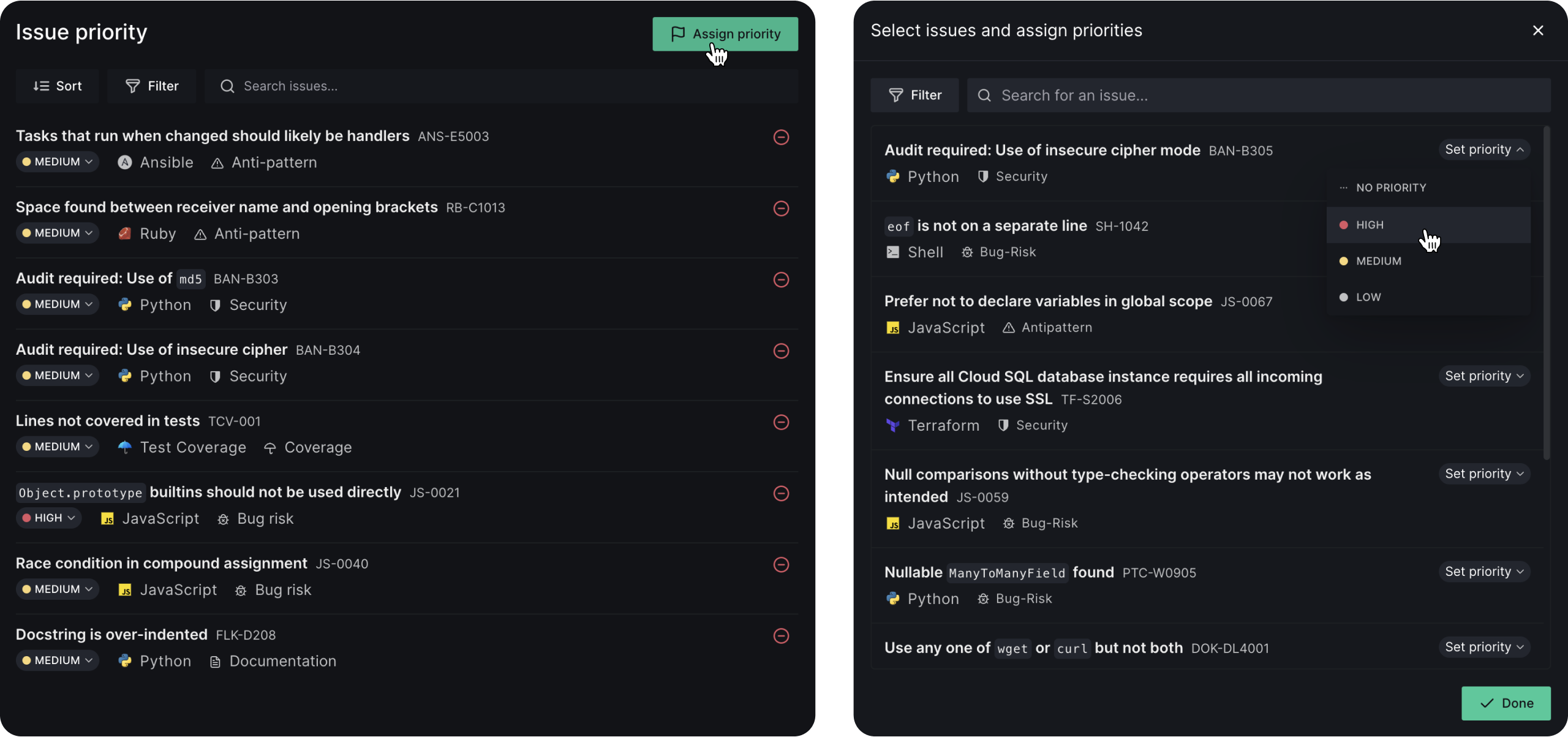 You can set issue priorities in the DeepSource Dashboard to help prioritize and focus on the most important issues. Assigning a priority of High, Medium, or Low to each issue can help you quickly identify and address critical issues while ignoring less urgent ones. This feature can help you streamline your workflow and make your issue management more efficient.