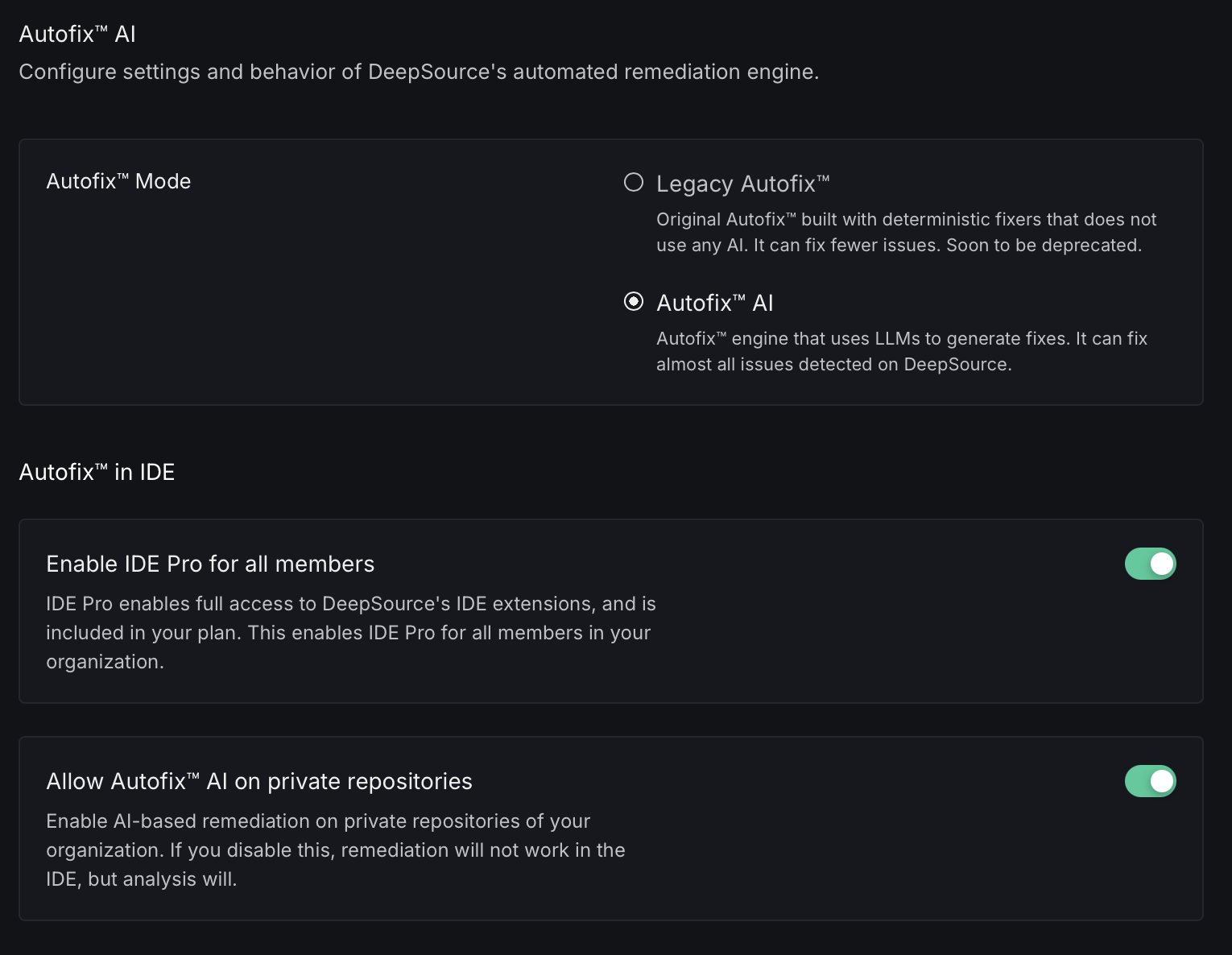 - Allow Autofix™ AI on private repositories: Enable or disable AI-based remediation for private repositories in your organization. If disabled, remediation won’t work in the IDE for private repositories, though analysis will continue to function.