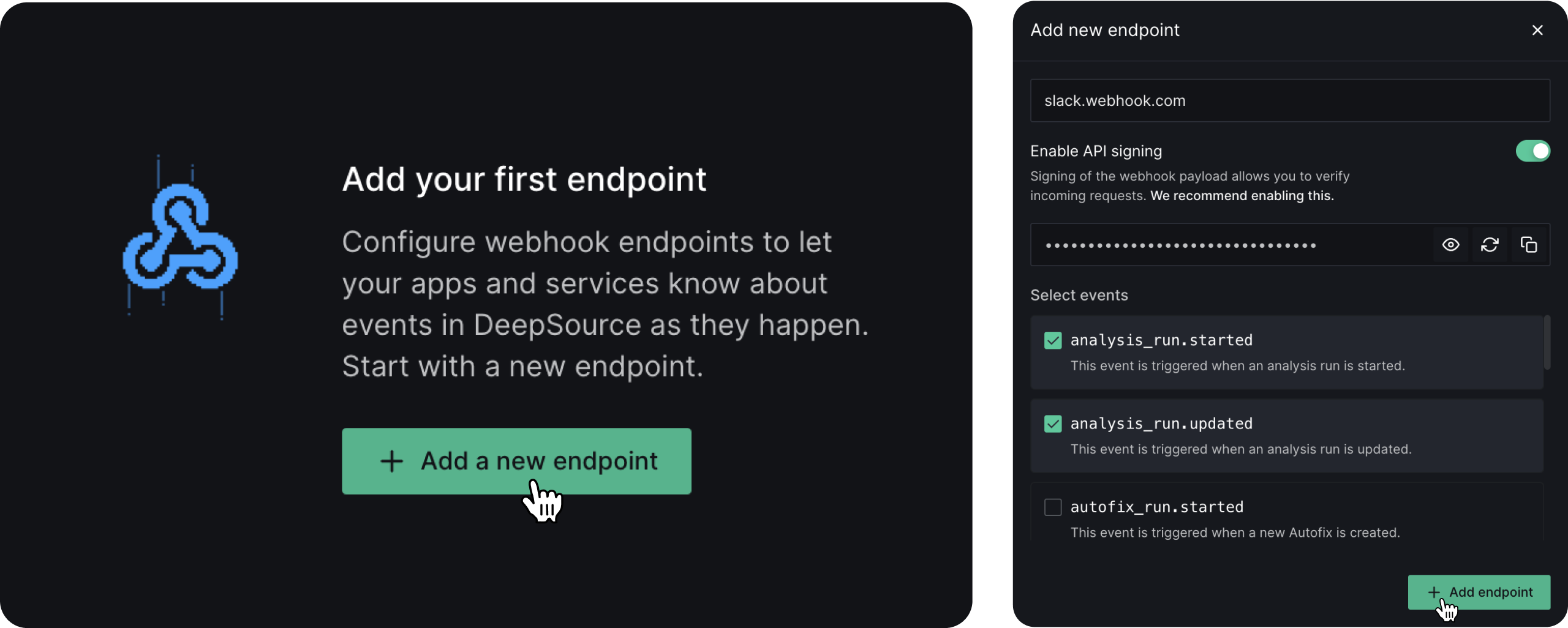DeepSource’s webhooks allow you to automatically trigger reactions in response to specific events that occur in your account. With webhooks, you can easily integrate DeepSource with your other tools and services, such as issue trackers, messaging platforms, and more. To get started, configure an endpoint URL that can receive a POST request from DeepSource whenever an event is triggered. You can also choose to enable API signing, which adds an extra layer of security by including an HMAC signature of the payload. To configure your webhooks, click on ‘Add new endpoint’ and provide the required details, including the endpoint URL, webhook secret, and one or more events to trigger the webhook. Note that webhooks are only available for organization accounts.