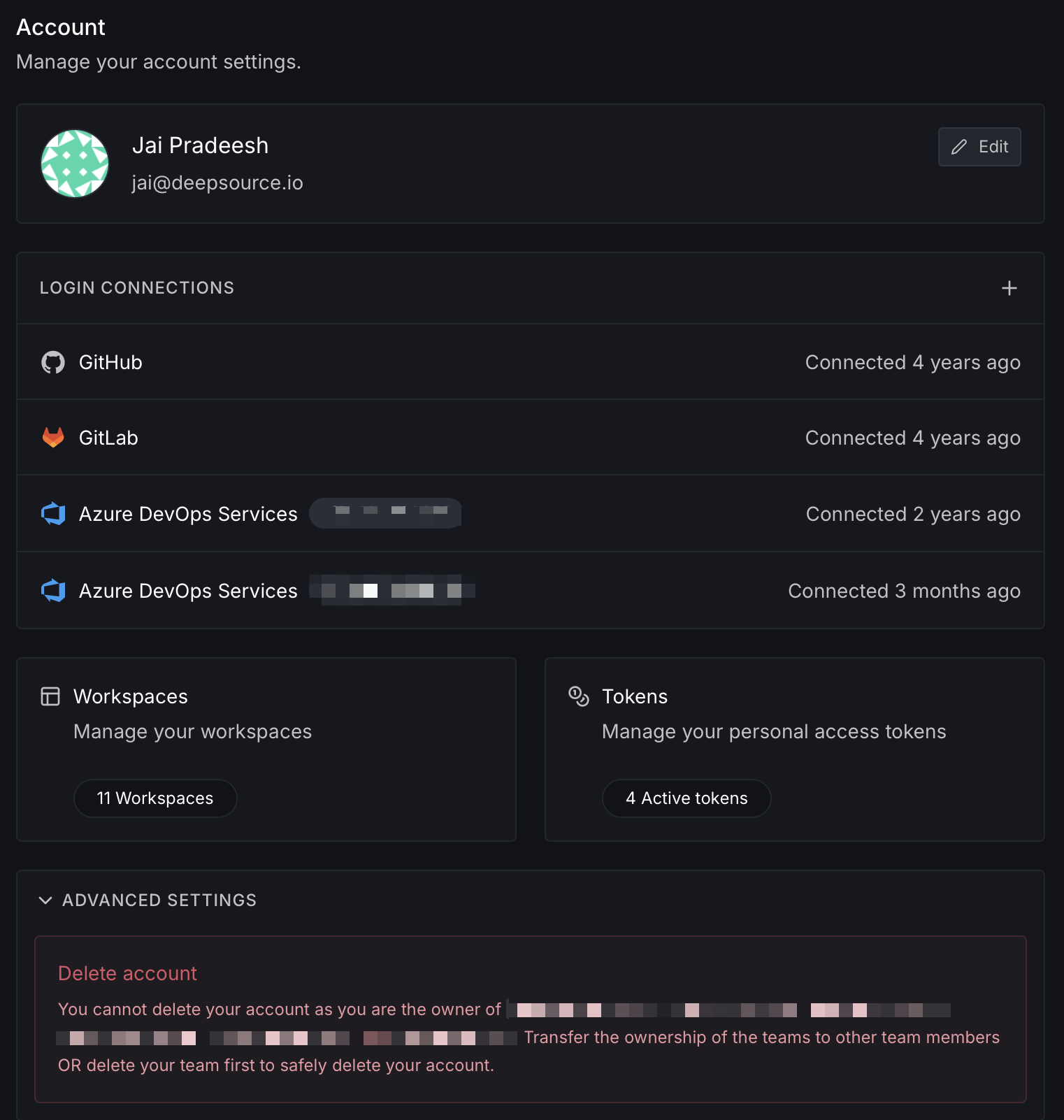 - Login Connections: Manage source control VCS integrations (GitHub, GitLab, Bitbucket, AzureDevOps) and connection timestamps showing connection history and status.