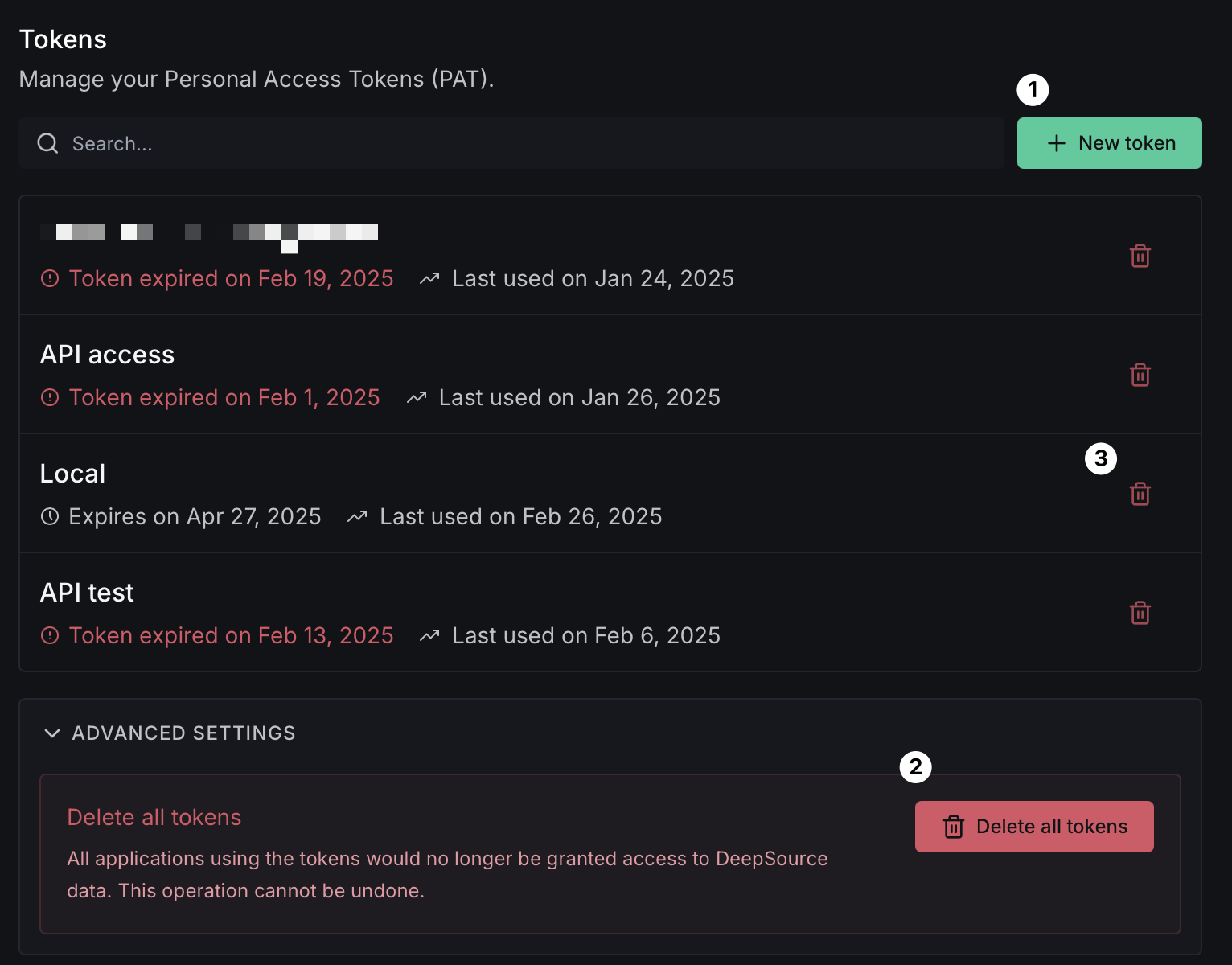 - Deletion Options [2] [3]: Remove individual tokens or use the advanced option to delete all tokens at once