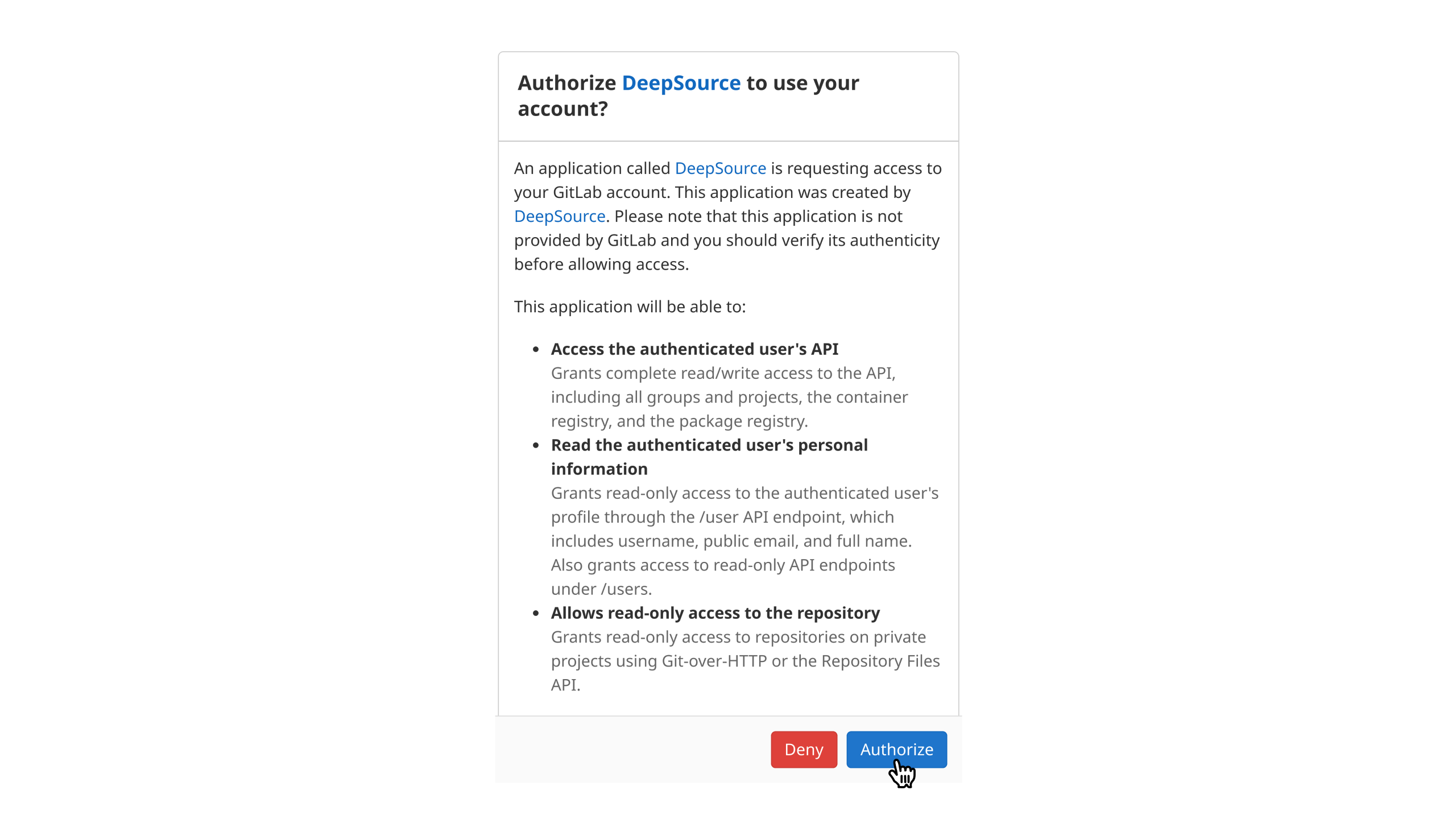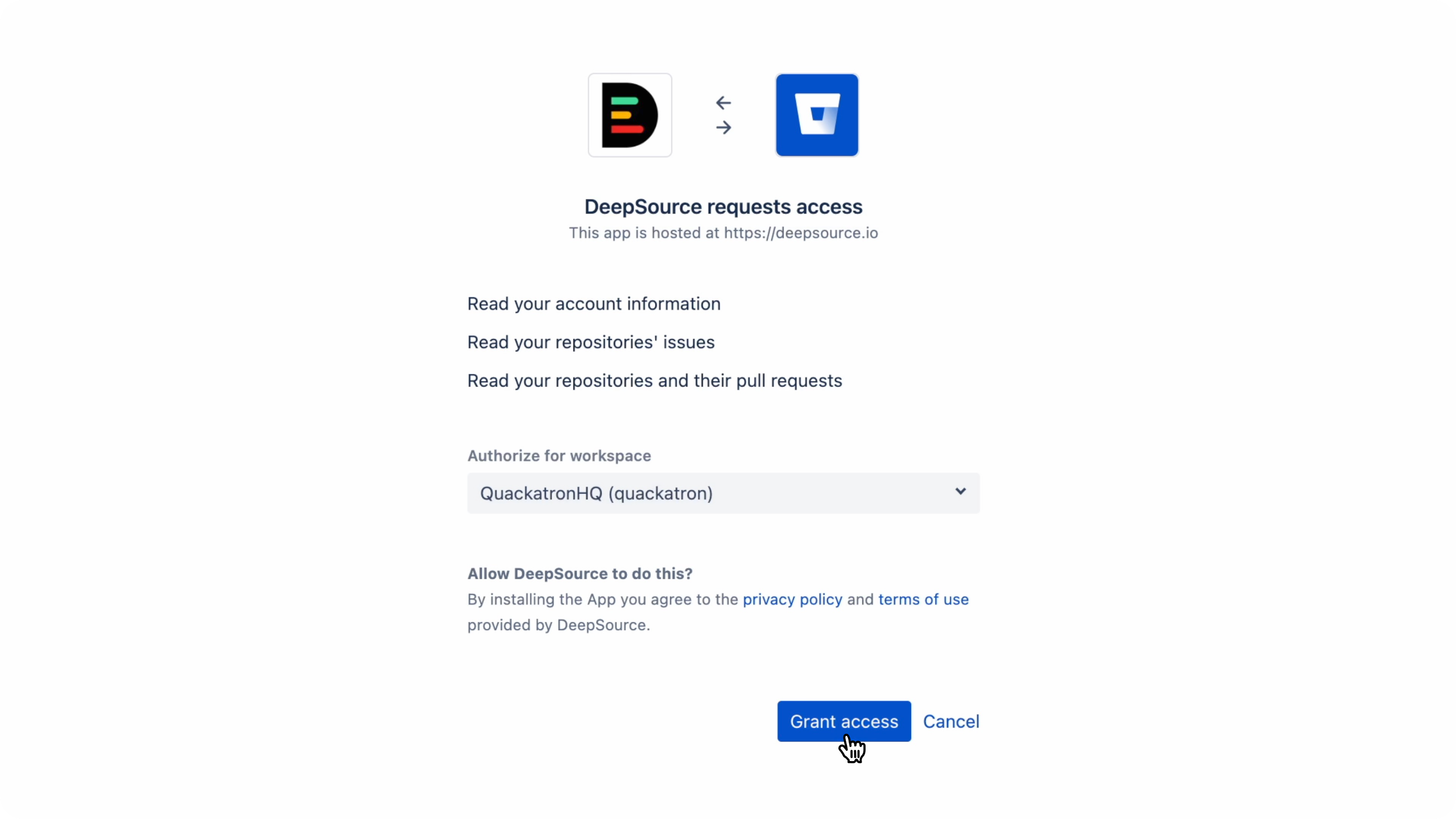 - Install the DeepSource App on Bitbucket. From the “Authorize for” list, select the account (user, or organization) for which you want to enable DeepSource and click “Grant Access”.
