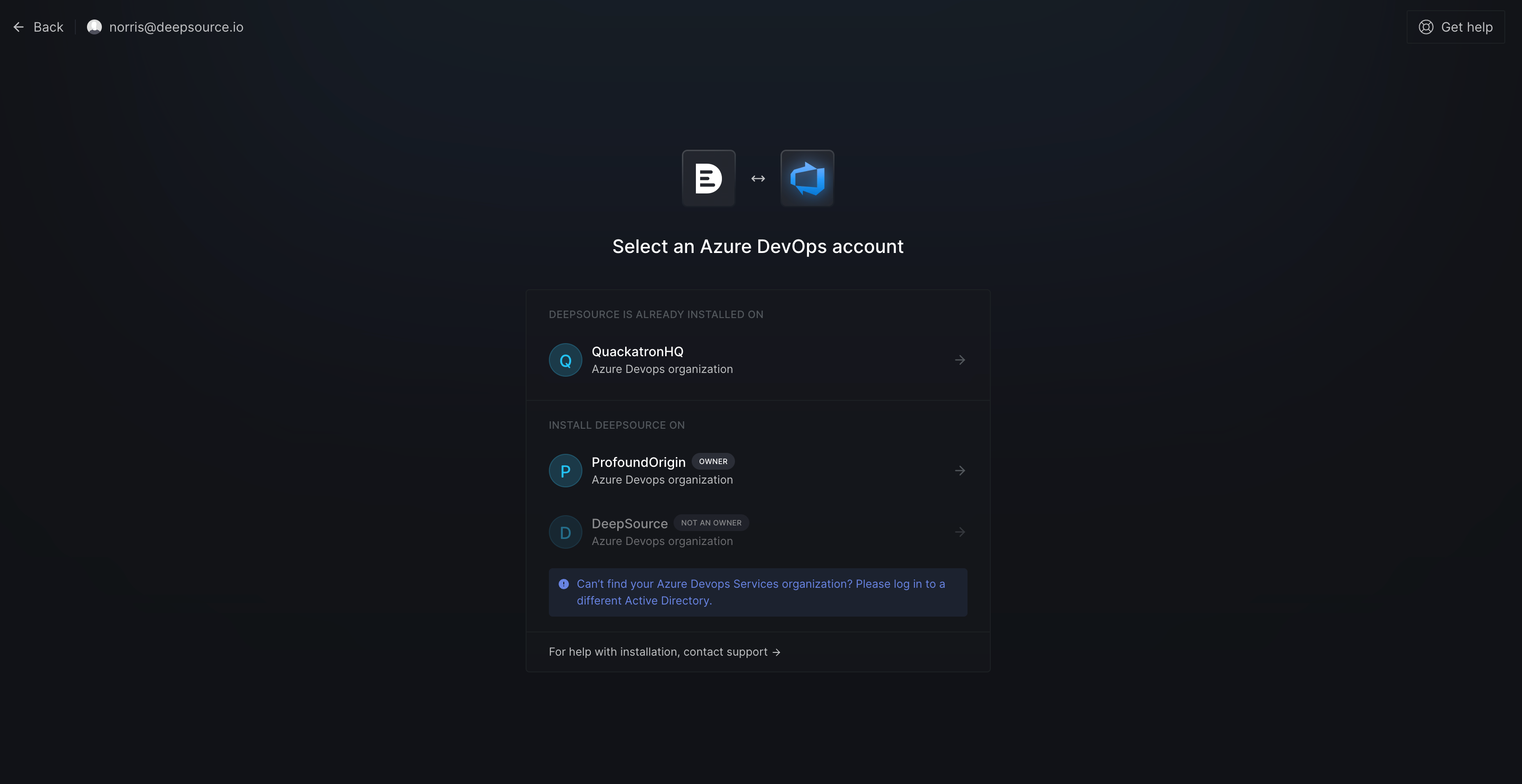 DeepSource supports connection to multiple Azure AD tenant(s). Organizations from across all your ADs connected to your DeepSource user account are shown on the installation page.In case you logged in with the wrong Azure AD tenant, please follow these steps: