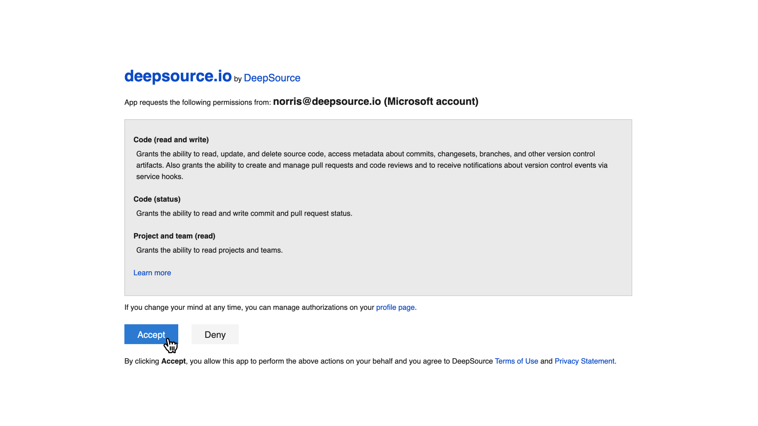 - Login on https://app.deepsource.com/login again, choosing the correct AD when redirected to azure’s website.