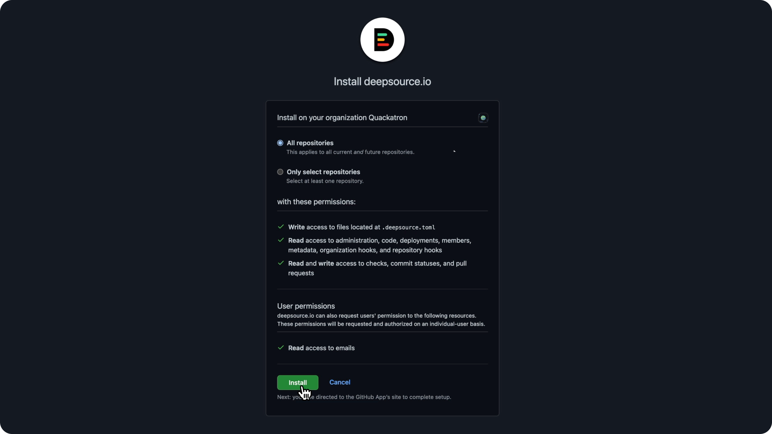 - From the list, select the account (user, or organization) for which you want to enable DeepSource and click “Install”.