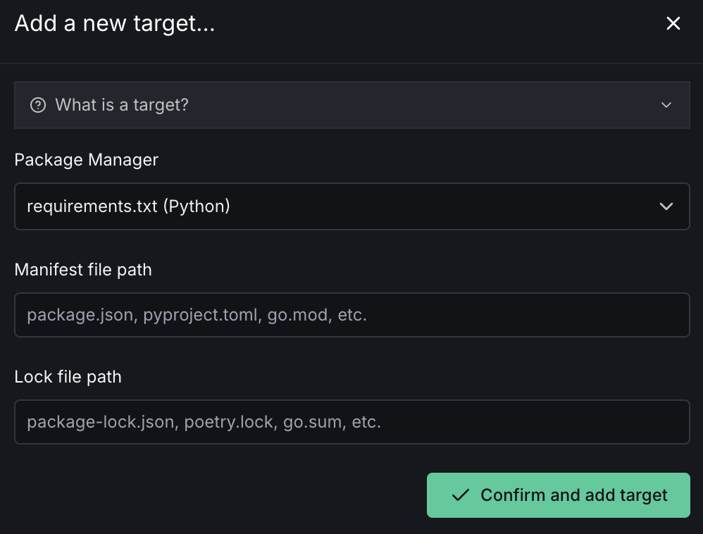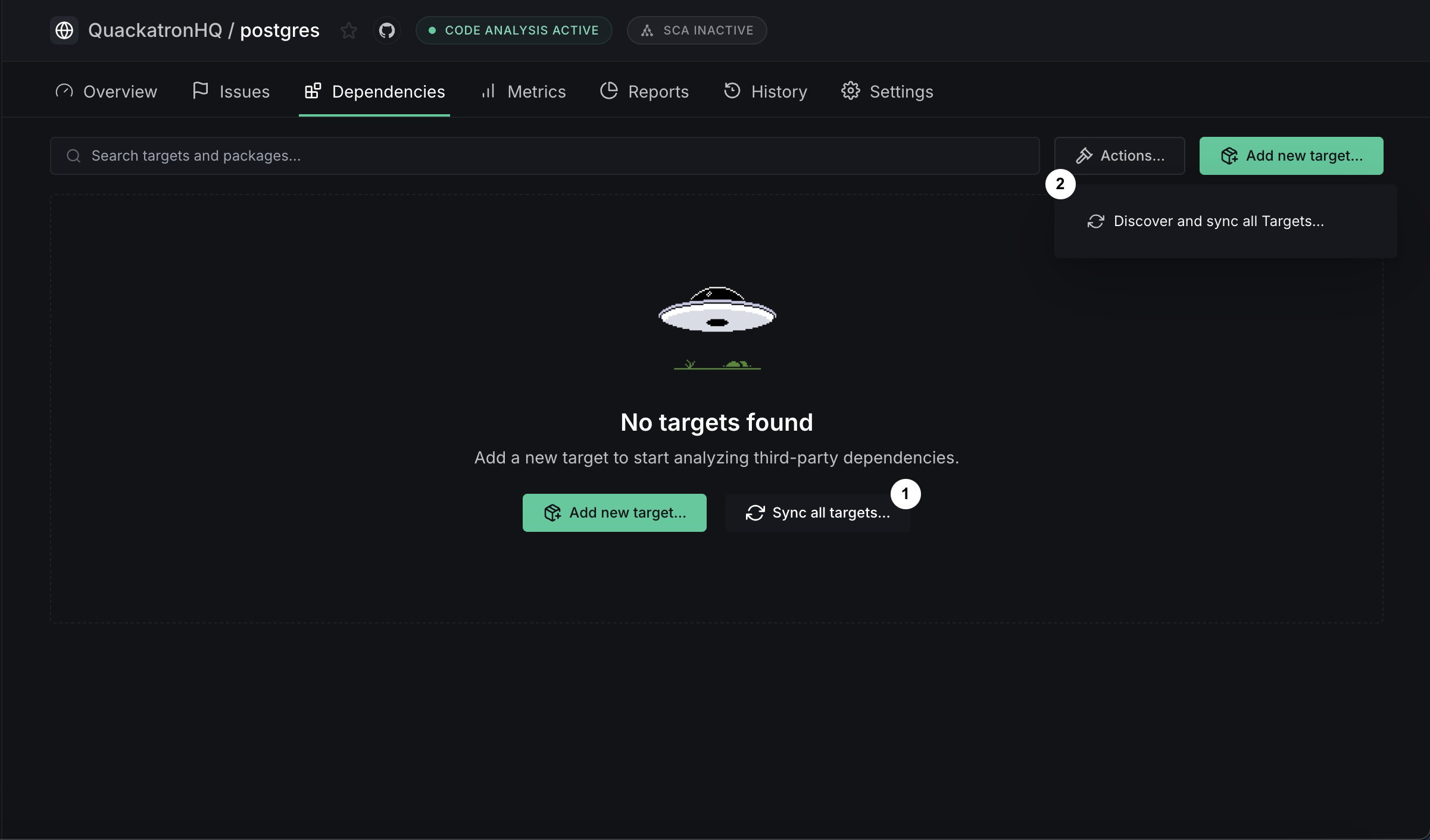 - Click ‘Sync all targets…’ [1] or ‘Actions… -> Discover and sync all Targets’ [2] to discover all manifest files in your repository. You can also manually add targets by clicking “Add new target…” and specifying your package manager, manifest file path, and lock file path.
