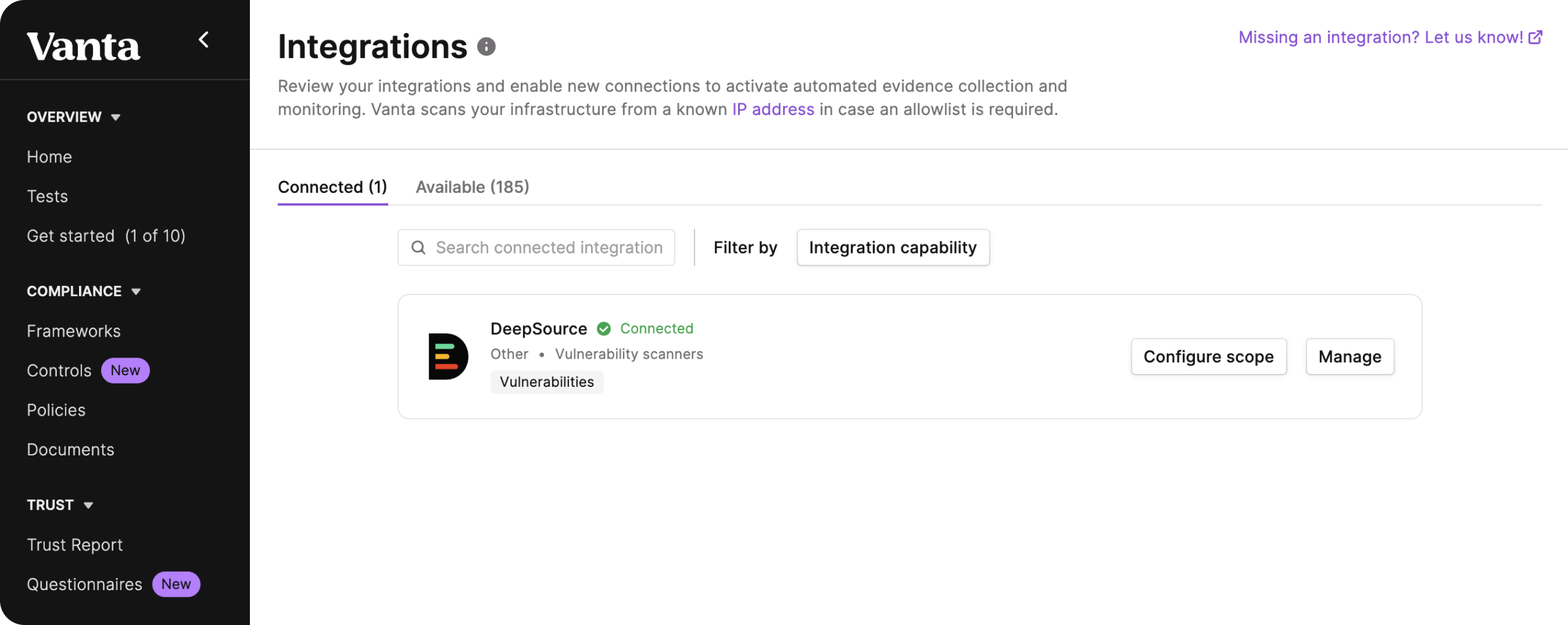 4. On your Vanta account, head over to the 'Integrations' tab in the sidebar and you should see that DeepSource has been successfully connected.