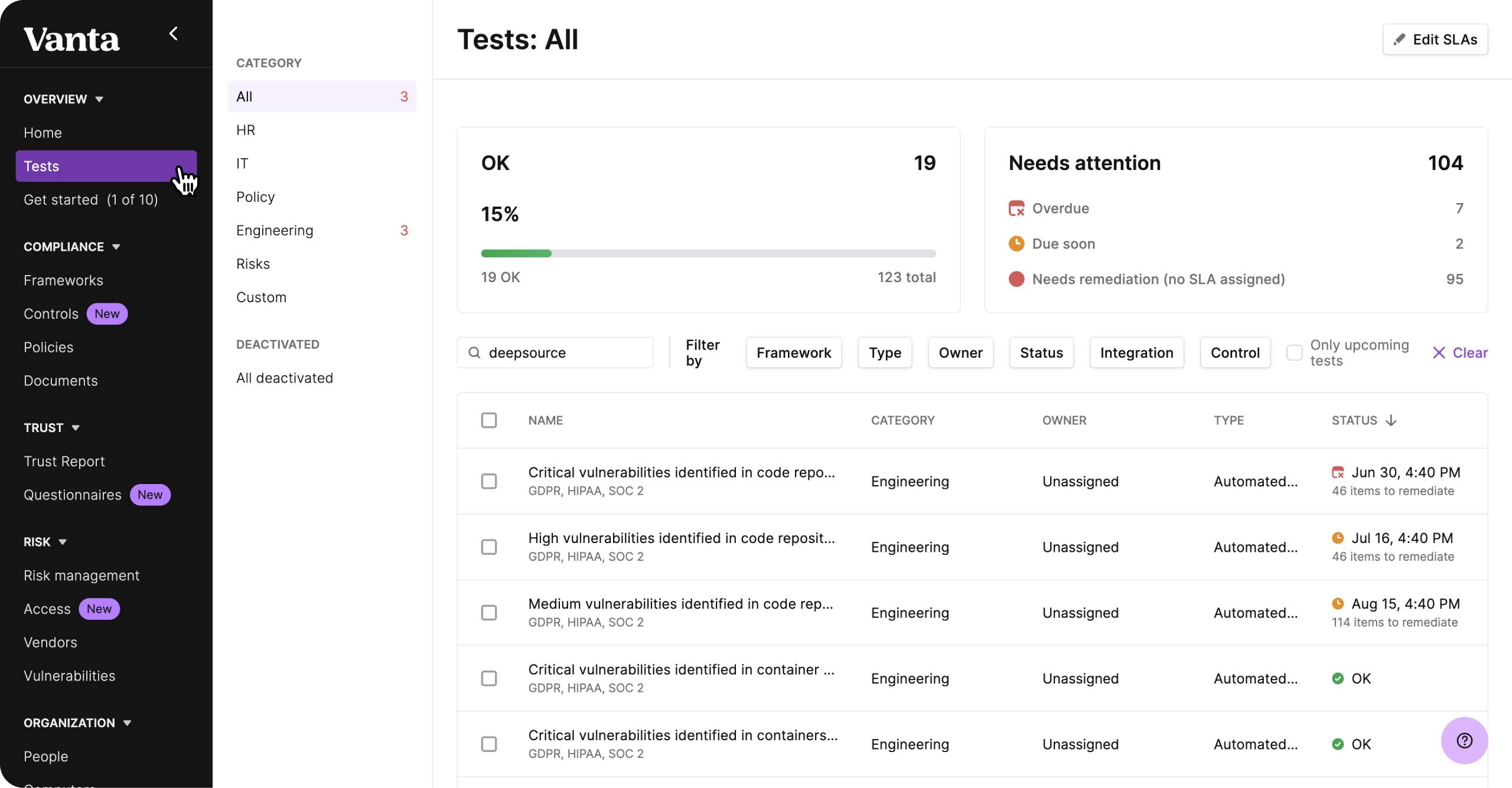 Security issues raised by DeepSource will show up under Tests and Assets, in the sidebar of your Vanta dashboard. This includes both code vulnerabilities (SAST) and vulnerable open-source dependencies (SCA). If any of these issues cause a SOC 2, ISO 27001, PCI DSS, or other compliance control to fail, you'll get notified. You can then navigate to the repository on DeepSource and fix them.