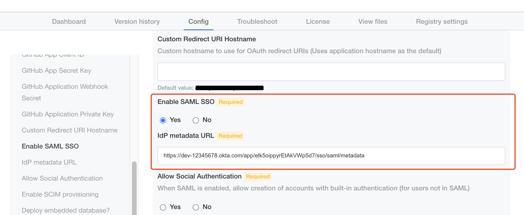 - One last piece of configuration is whether you want to enable social authentication (i.e. allowing users to be created/log in with GitHub) alongside SAML. In this case, users will be allowed to either sign in via SSO or via OAuth. Choose accordingly.