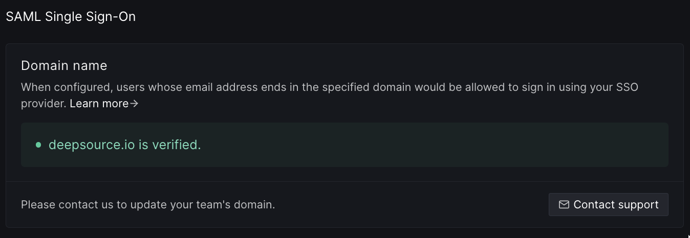 Before you can connect an Identity Provider (IdP) to your DeepSource team, you need to first verify the ownership of your organization’s email domain. This should be the domain name of your user’s email addresses used for signing into DeepSource.Request domain verification
