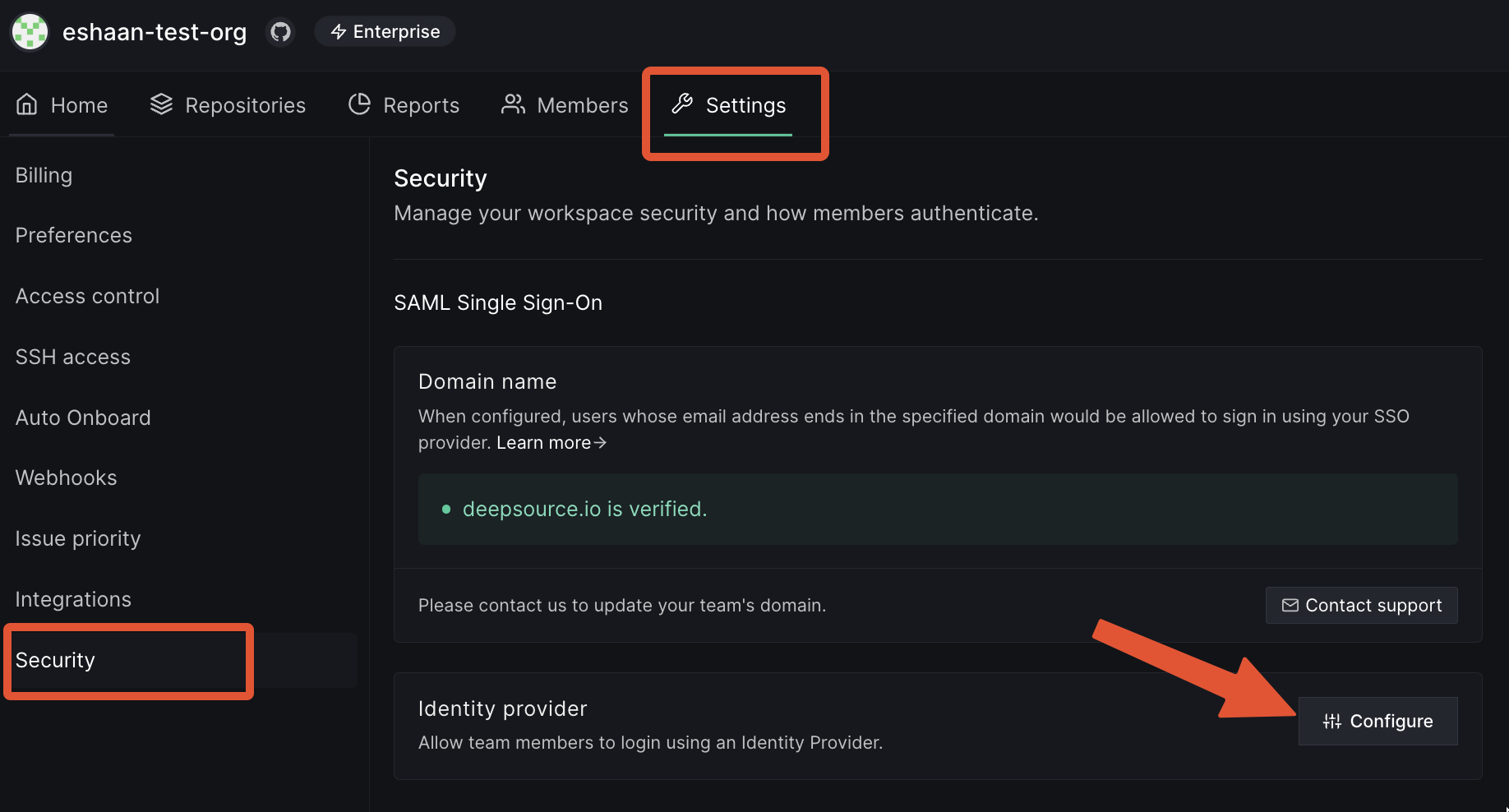 Once DeepSource has verified your domain and you have successfully created and tested a SAML 2.0 connector on the IdP website, you need to tell DeepSource about it.- On the same Team settings -> Security page, click on the Configure button.