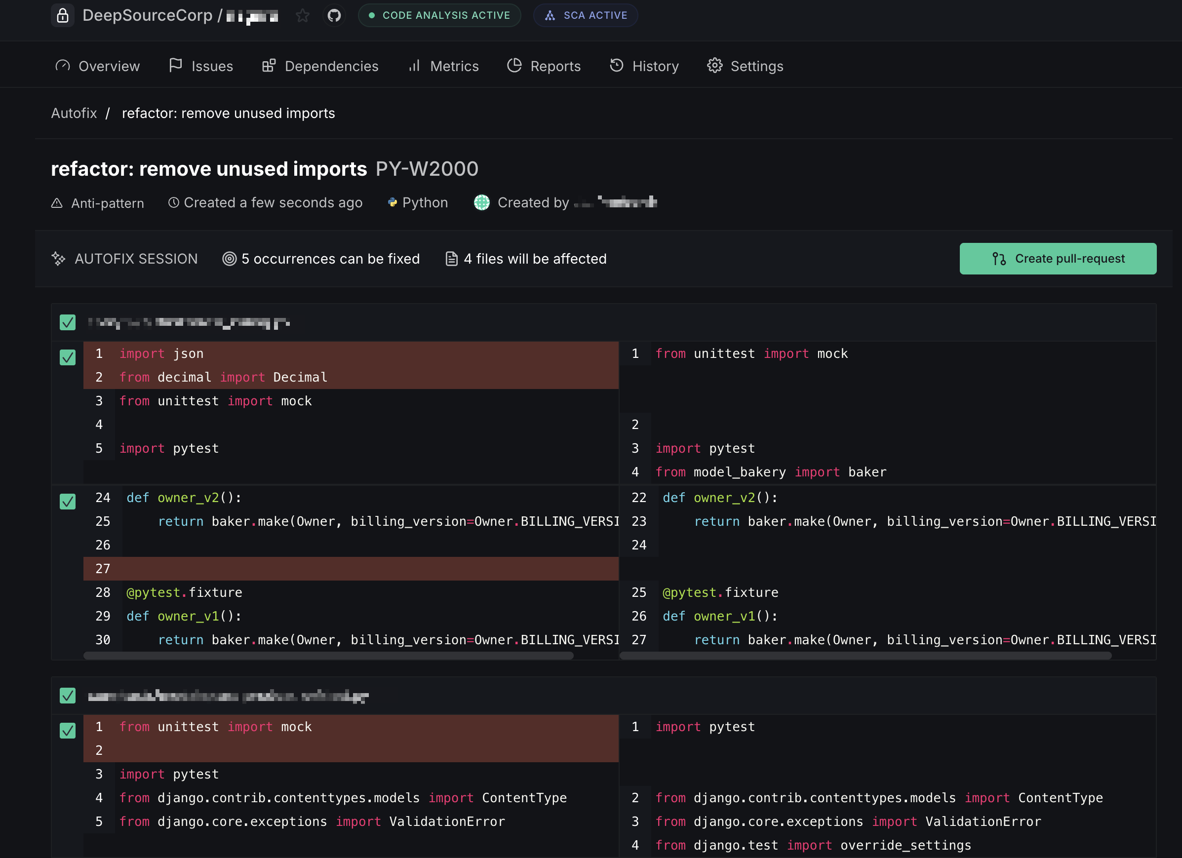 - Create pull request — when Autofix is triggered from a default-branch analysis, the fixes are submitted as a new PR