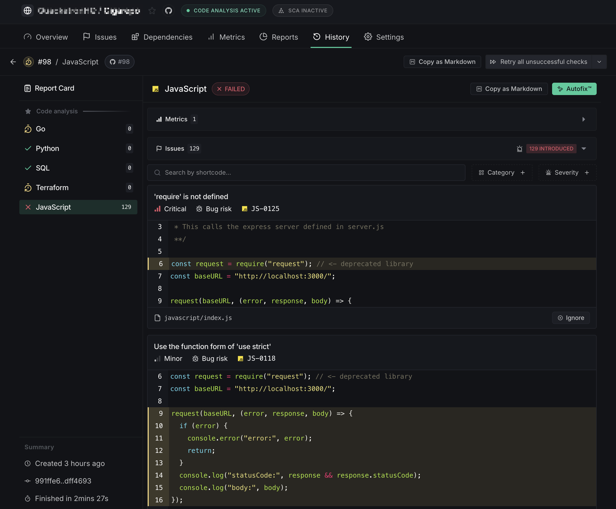 When you trigger Autofix for an issue, the resulting session appears in the History tab.