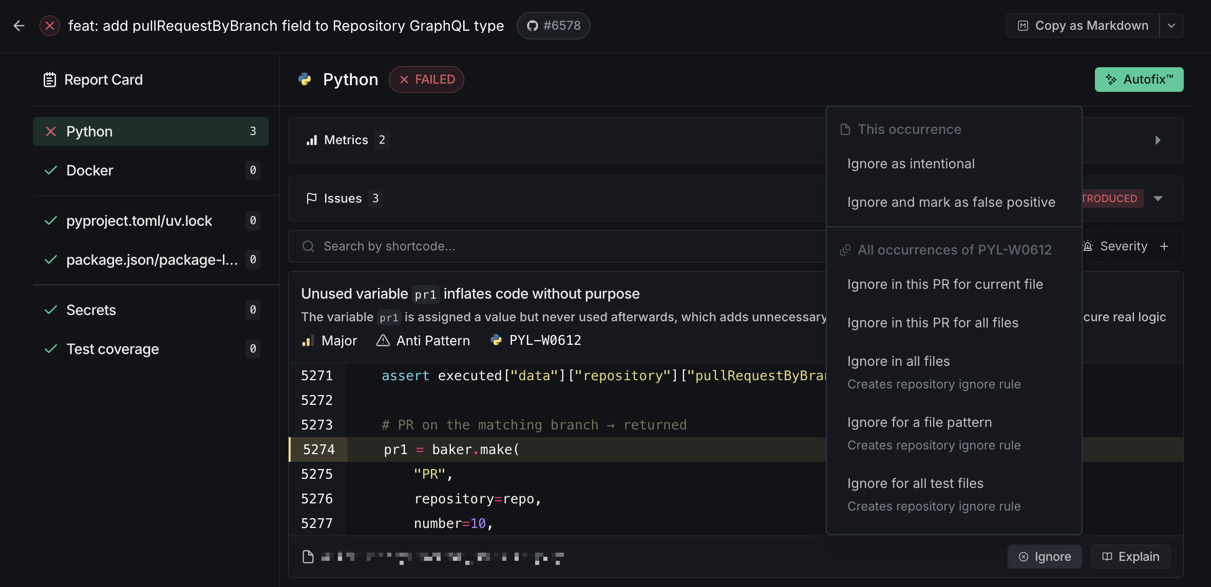 - In this PR — Ignore in the current file only, or across all files in the pull request