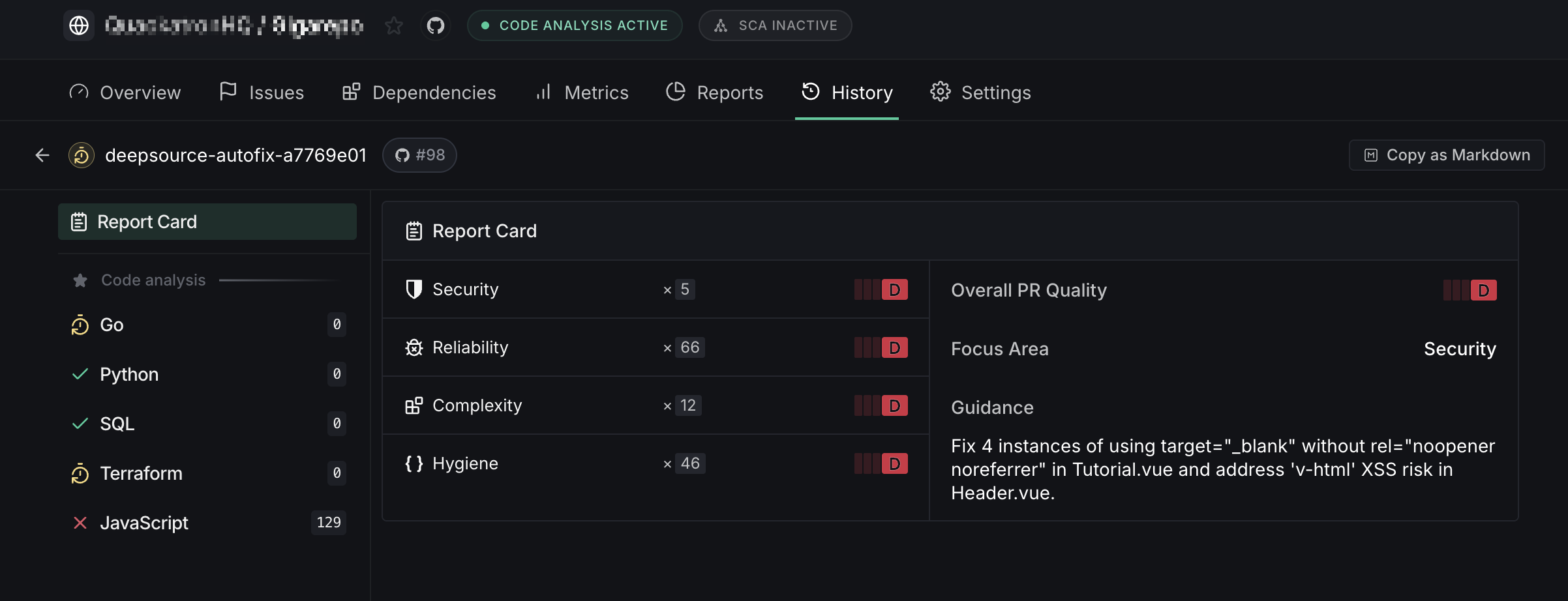View analysis history, PR Report Card grades, and detailed issue breakdowns for each run.