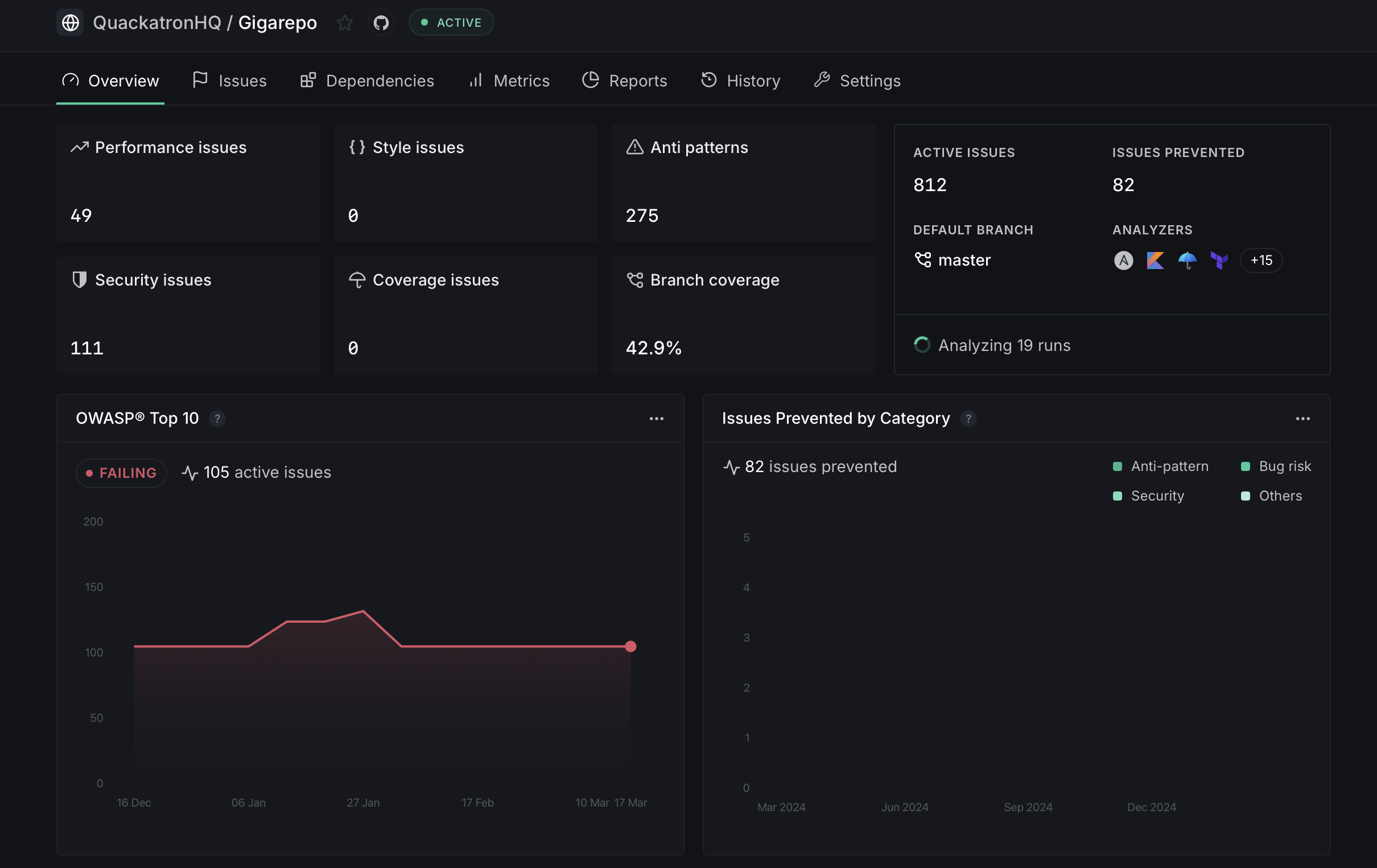 - Analyzers — The active analyzers configured for this repository, along with the current analysis status