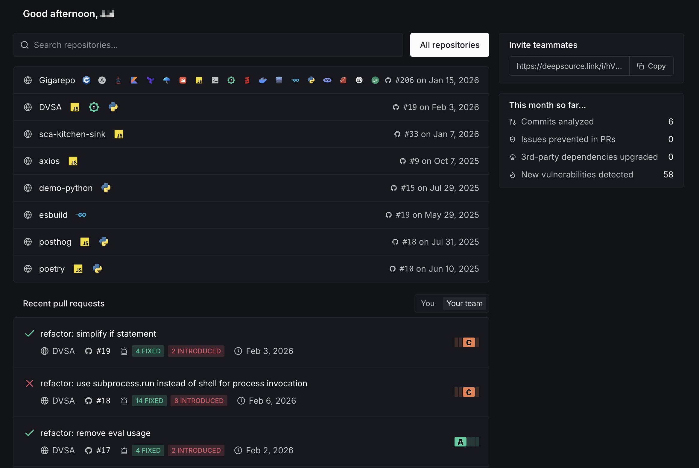 Invite team members to your DeepSource workspace by sharing the invite link on this page. See Members for more on managing access.