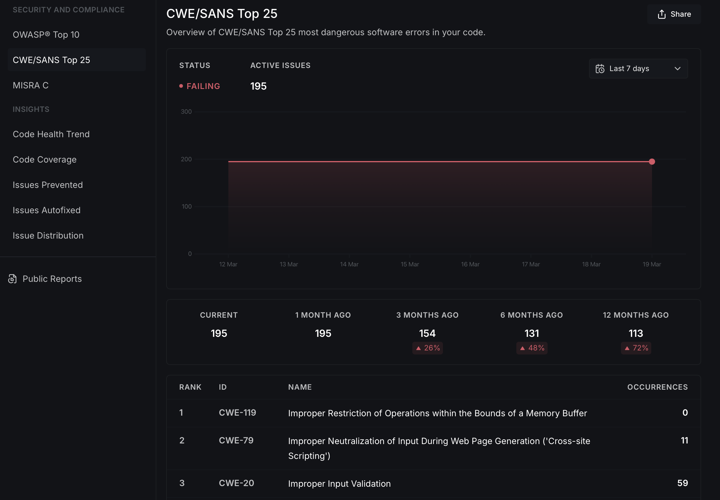 Shows your organization's standing against the CWE/SANS Top 25 most dangerous software errors, ranked by severity and occurrence count.