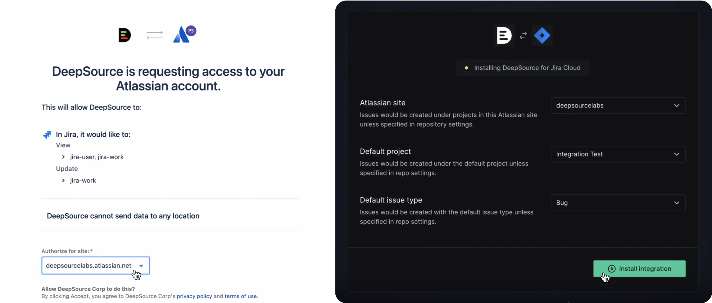 - Choose the Atlassian site, Default project, and Default issue type, and click on "Install integration."