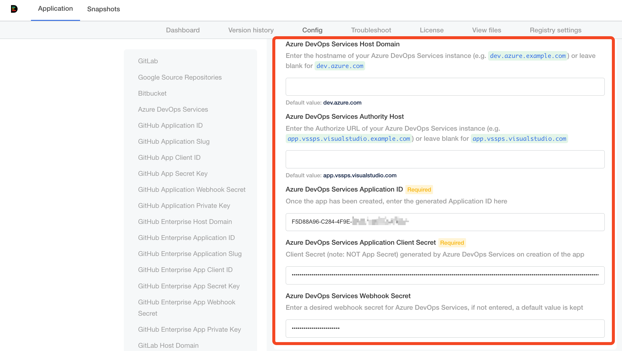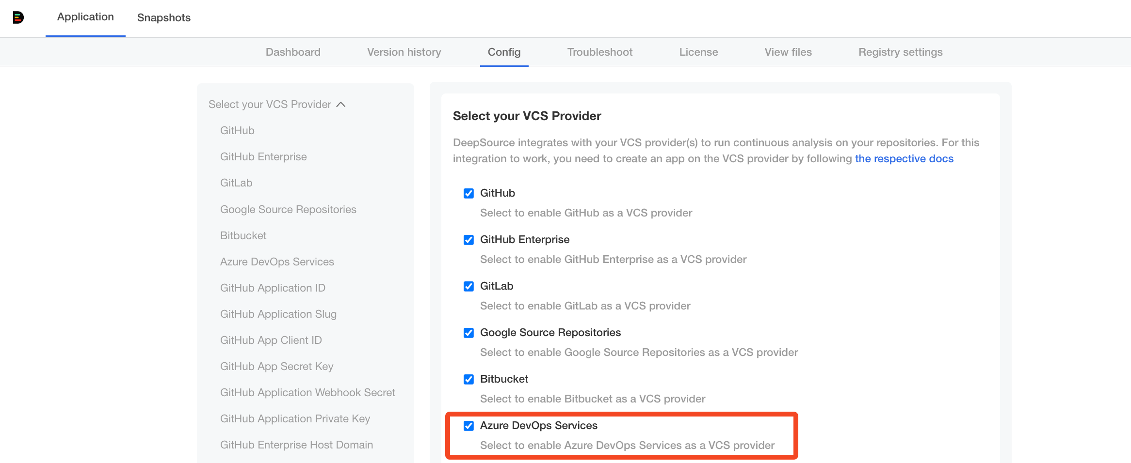 After you have created your Azure DevOps application, you need to configure it in the DeepSource Admin Console.
