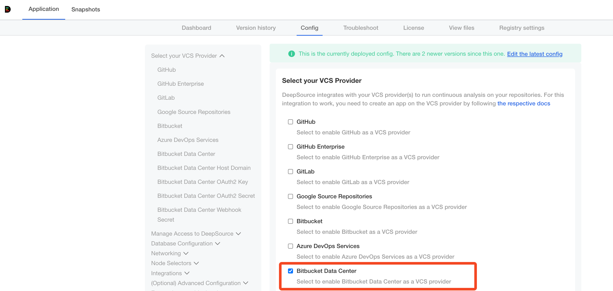 After you have created your Bitbucket Data Center application, you need to configure it in the DeepSource Admin Console.