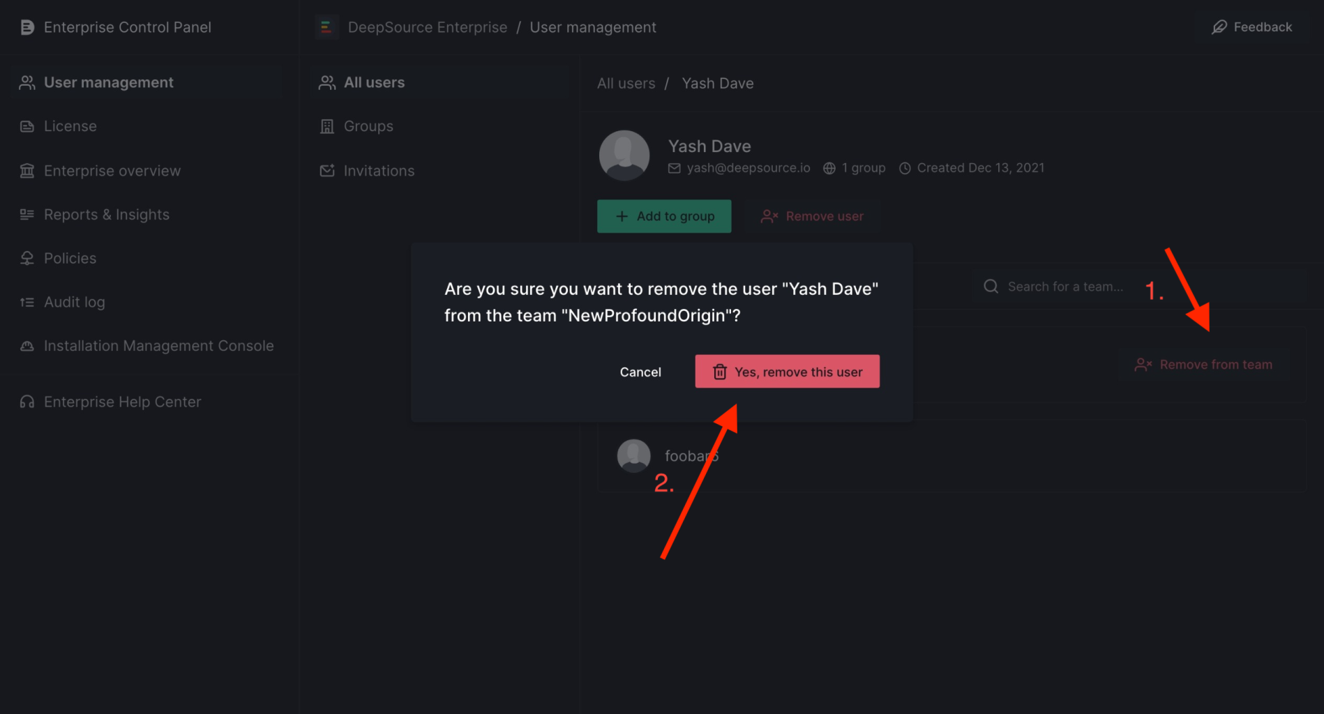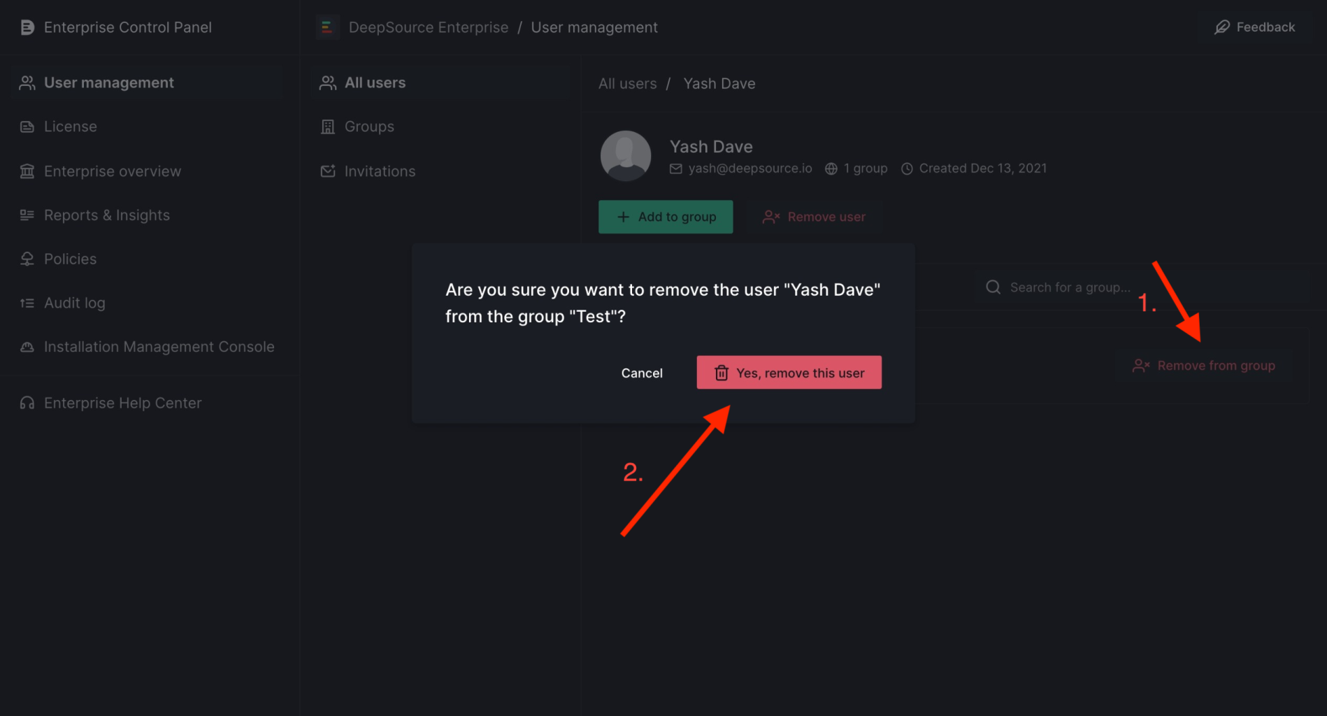 Manage all users within your enterprise from theUsers section in user management. Check which groups and teams they are a part of, add them to groups of choice, and remove them if needed!
